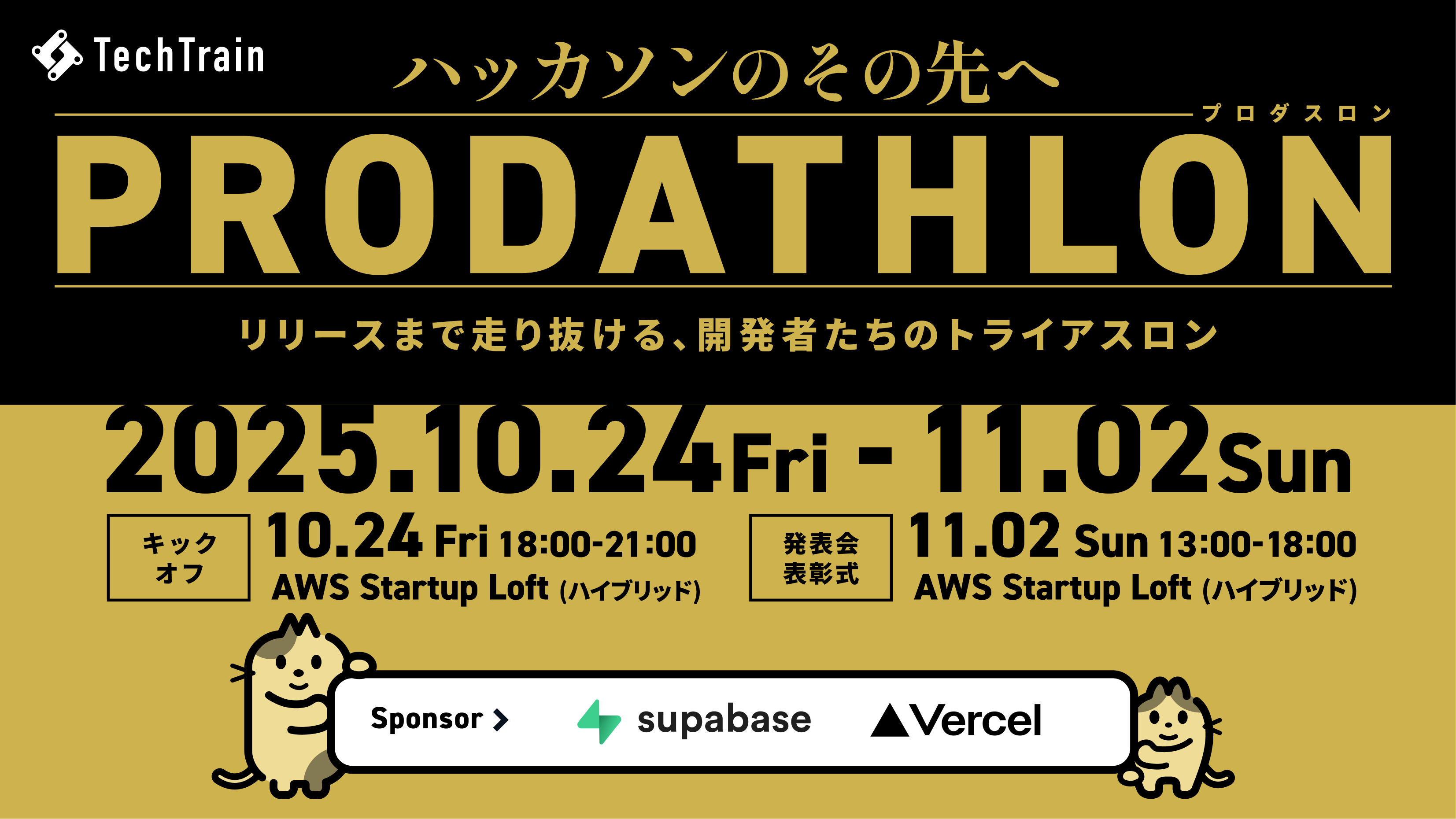 "10日間にわたり、頭も体力も使い切る...プロダクト版トライアスロン「PRODATHLON」の挑戦者、求む!!!"「PRODATHLON(プロダスロン)」とは?“Product”+“Triathlon”を掛け合わせた造語。 設計から実装、そしてサービスリリースまでを走り切る、従来のハッカソンの先をゴールに見据えた本気のプロダクト開発イベントです。 アイデア出しで終わらせず、設計・実装・公開まで、プロダクトづくりのリアルに挑戦するための場