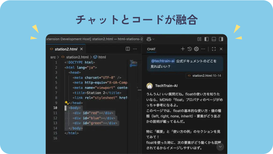 チャットとコードが融合した環境で、開発中の疑問を即座に解決。日々の開発活動のすぐそばで、学びの機会を提供します。