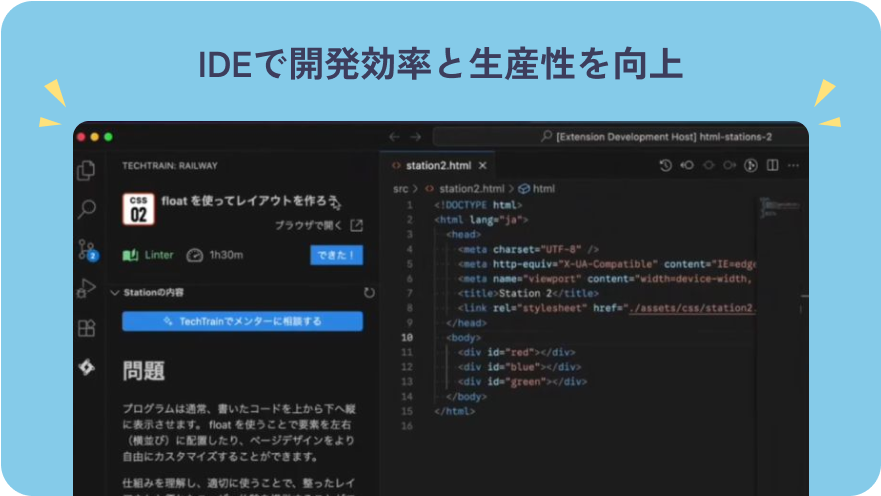 VS CodeをはじめとしたIDEで、issue単位の問題に挑戦可能です。実務さながらの環境で実践的な開発力が身につきます。